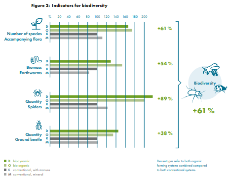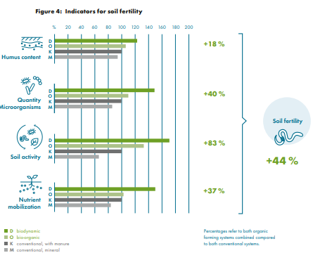 Mulla viljakus (Indicators for soil fertility) - Maheviljeluses säilib või suureneb huumusesisaldus (Humus content), samas kui tavaviljeluses langeb pH ja huumusesisaldus. Biodünaamilises süsteemis oli mikroobide aktiivsus (Quantity Microorganisms) ja fosfori mobiliseerimise võime 50% kõrgem kui tavaviljeluses. Kõik viljakuse näitajad, mulla aktiivsus (Soil activity) ja toitainete liikuvus (Nutrient mobilization) olid maheviljeluses paremad.